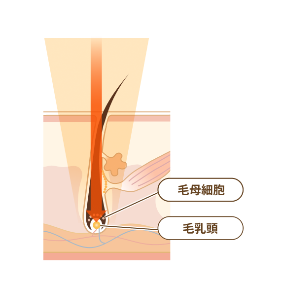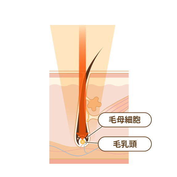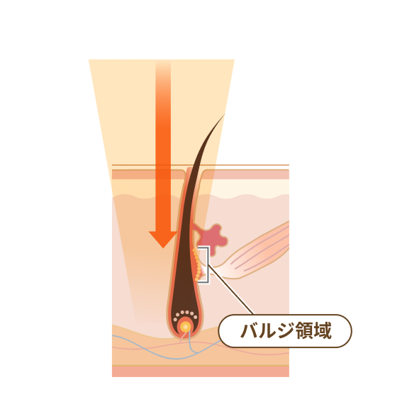 蓄熱式脱毛は、レーザーを毛包全体にじっくりと照射し、毛を生やす指令を出すバルジ領域の毛包幹細胞を破壊する仕組みです。低い温度で熱を蓄えるように働くので、肌への負担が極めて少なく、火傷や、肌の赤み、腫れ、色素沈着のリスクが抑えられます。また、蓄熱式は毛のメラニン色素をターゲットにしないので、色素沈着がある肌や色黒の肌にも脱毛効果を発揮します。