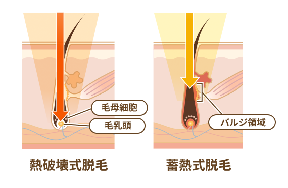 ジェントルレーズプロは、熱破壊式の医療レーザー機です。高出力のレーザーを照射し、毛乳頭と毛母細胞を破壊し、再発毛を予防する照射方式です。