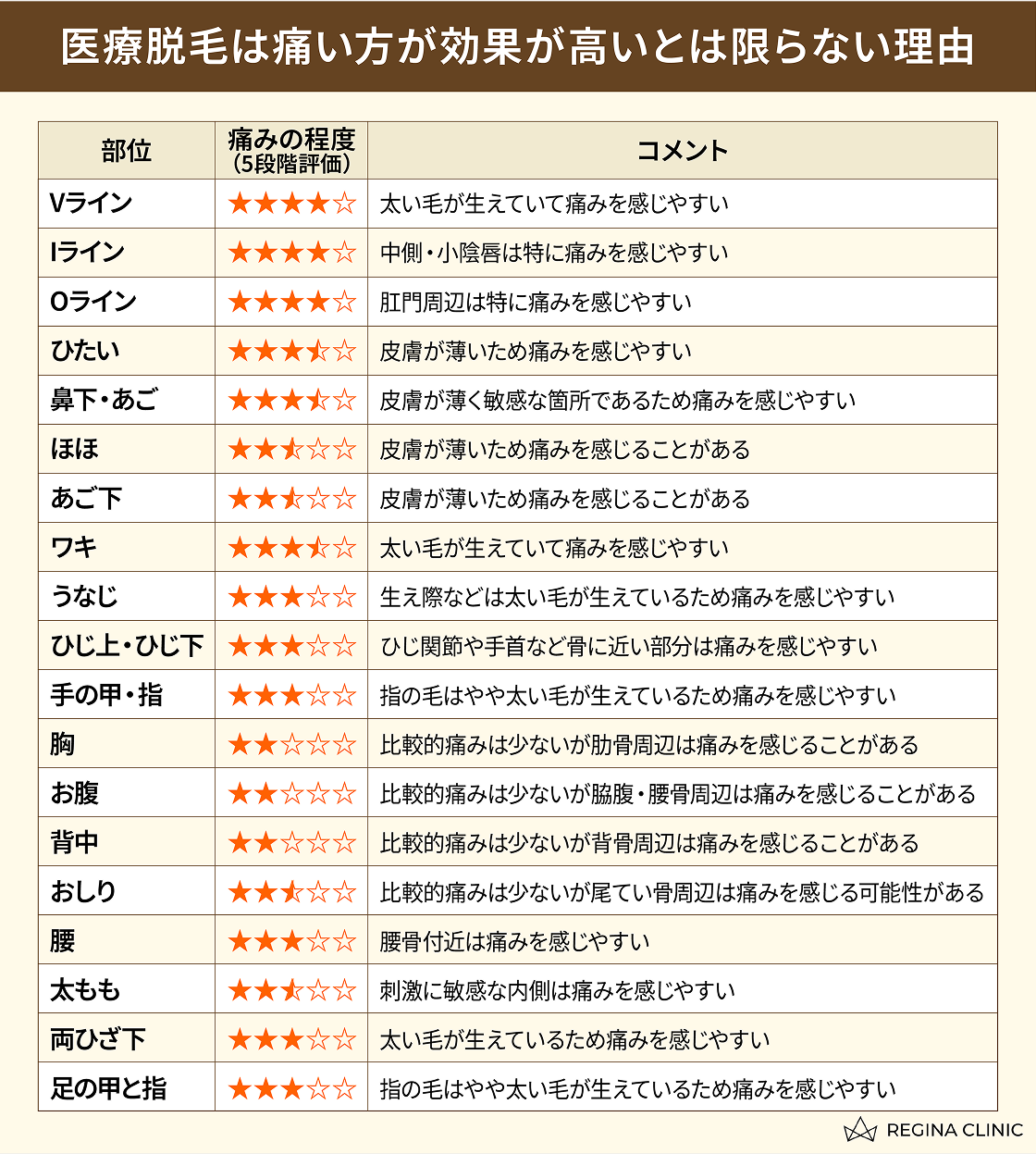 レジーナクリニックの基準で、部位別の痛みを5段階でまとめました。