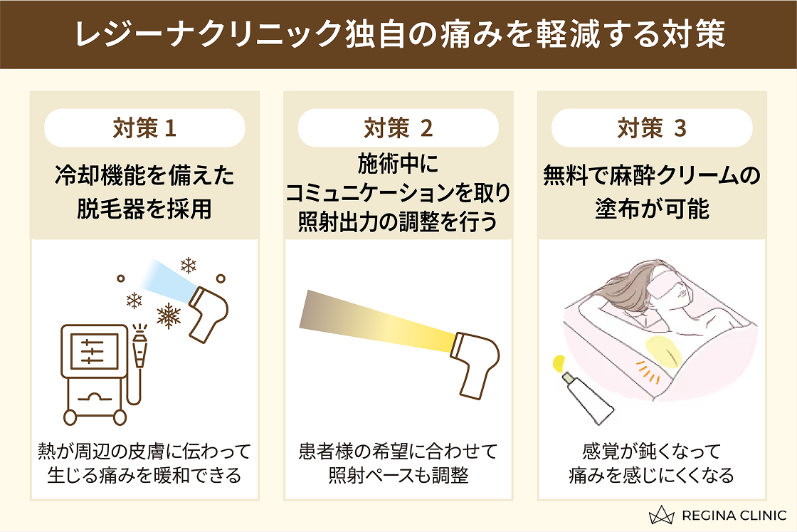 レジーナクリニックでは以下の3つの対策を行っているため、痛みをできる限り抑えながら施術できます。