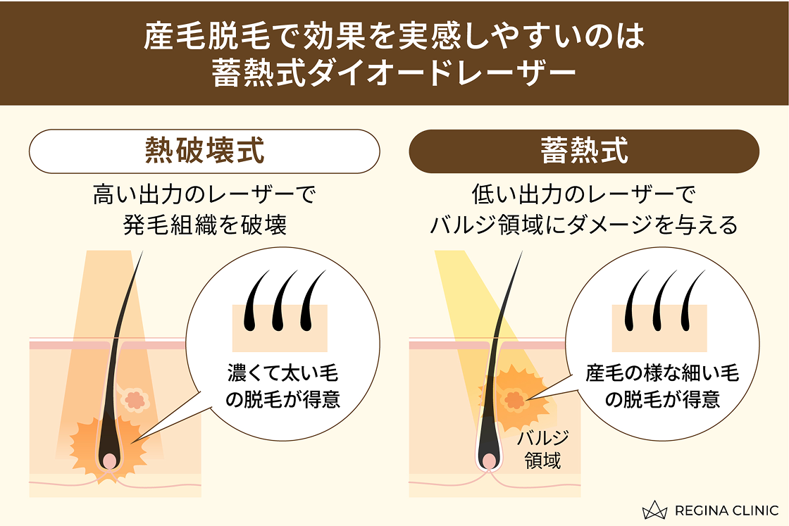 産毛まで脱毛したい方は、低出力のレーザーを連続照射して毛根に熱をためて、バルジ領域を破壊する蓄熱式レーザー脱毛がおすすめです。