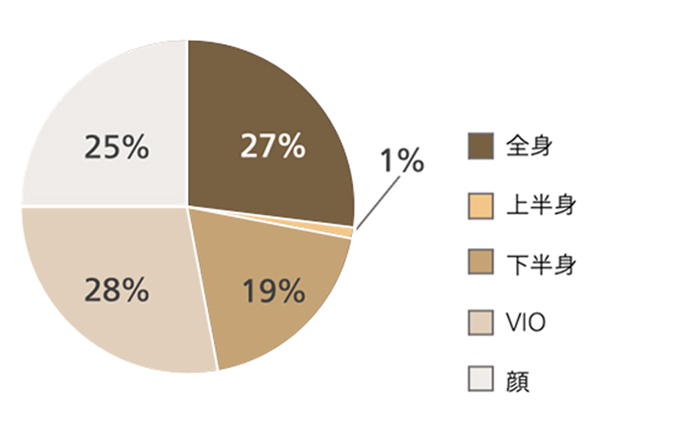介護脱毛で施術を希望する部位は、「VIO(デリケートゾーン)」(28%)「全身」(27%)、「下半身」(19%)と、VIOや下半身を含む施術プランへの関心が過半数以上を占めました。