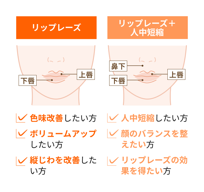 患者さまのお悩みに合わせて2種類のリップレーズのプランをご用意。通常のプランでは唇のみに照射しますが、人中短縮+リップレーズのプランでは、唇に加えてさらに鼻の下に照射して皮膚を引き締め、キュッと整った口元へ。顔全体のバランスが整い小顔効果も感じていただけます。